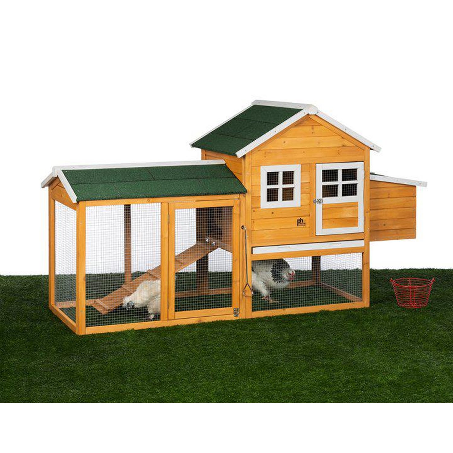 This adorable coop is compact yet roomy. The elevated coop allows hens full use of the enclosed chicken run. The coop interior features a removable floor tray for routine cleaning, two roosting bars, and full access to the 2-bay nest box. An interior coop divider door can be closed from the exterior with a jointed handle. Two access doors with barrel bolt locks and a lock-ready nest box lid allow access to all areas