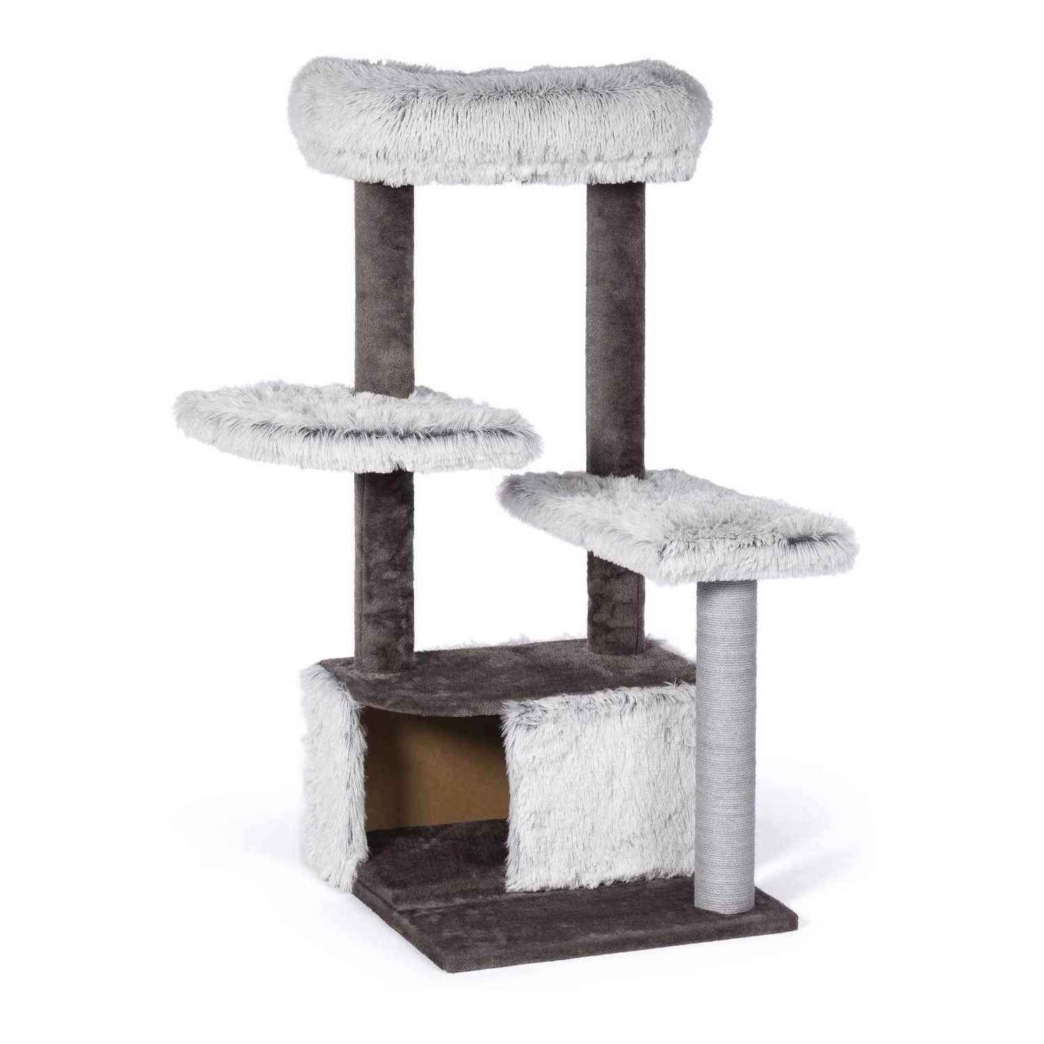 Prevue Pet Products Frosty Lounge 7323 combines super soft, plush fabrics with durable jute to provide the perfect place for lounging, sleeping, scratching, hiding, and playing. Our Frosty Lounge measures 3 1/2 feet tall A large plush bolstered day bed is a great spot for your kitten or cat to survey its surroundings or take a cat nap. Shag covered platforms provide opportunities for pouncing and jumping or multiple levels for more than one cat to lounge comfortably. Our cozy cave, lower level, hideaway makes your cat or kitten feel more secure and minimizes social stress. Rugged jute rope scratching post offers an appealing texture to cats, curbing inappropriate scratching behaviors. Our Frosty Lounge comes in dark gray and frost white and is a warm and welcoming addition to any home decor. Prevue Pet Products Frosty Lounge 7323 measures 29 1/4 inches Long, 19 1/4 inches Wide and 43 inches High.